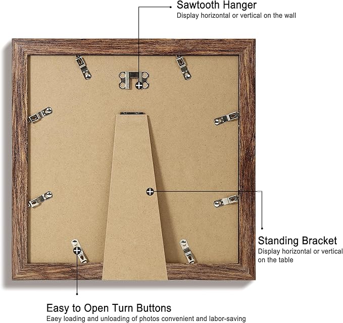 - VERSATILE DISPLAY: The 10 x 10 photo frame can showcase with a mat accommodate 8x8 photos, it allows both wall hanging and tabletop standing. You can choose to frame and display your picture in different ways.
