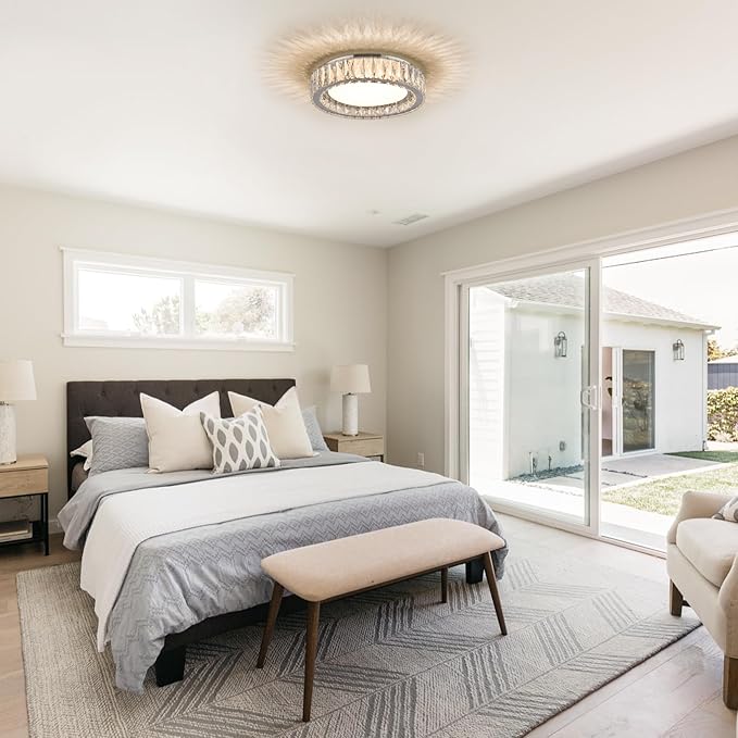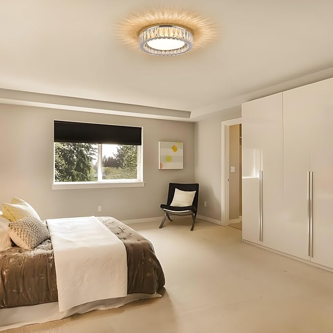 - Modern Luxury Design:This dimmable ceiling light k9 crystals and a polished metal body that is bright and shiny,when the light is turned on the crystal light refracts to around the ceiling providing a more luxurious sparkle,Suitable for any space like bedroom,kitchen,entrances,porches,hallway,laundry rooms,office,staircase,balconie and so on