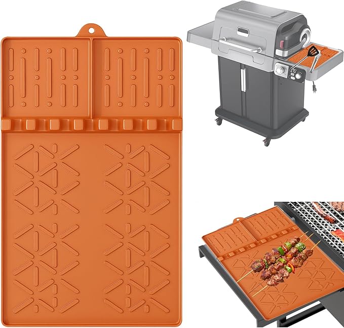 - 【Enhanced Anti-Slip & Anti-overflow Design】Featuring a simple raised vertical stripe anti-slip design, our BBQ accessories grill mats not only securely holds your tools in place, preventing accidental falls, but also facilitates effortless cleaning.