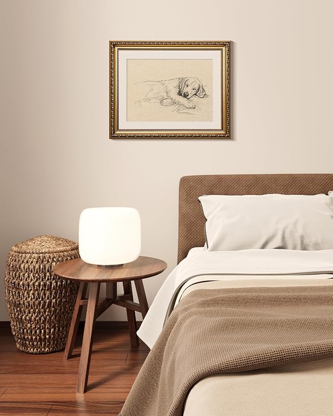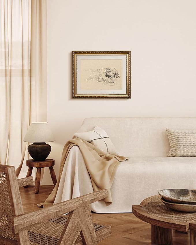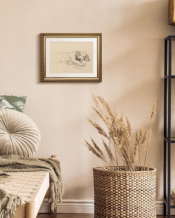 VIYYIEA Gold Framed Wall Art, Sleeping dog Canvas Print Home Decor Vintage Art Painting Picture Bathroom Wall Decor, Animals Artwork for Living Room Bedroom Kitchen Office - 16L x 13W