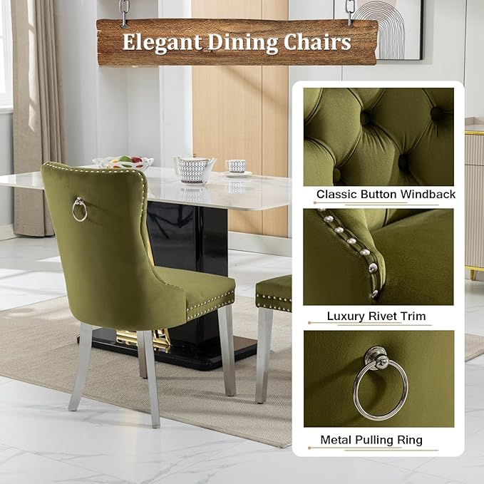 - ➤【Comfy Velvet Tufted Dining Chairs】- Tufted high backrest have a strong comfortable back support. Plenty decorative rivet inset around cushion and back make this chair looks noble and elegant. High density cushion with high rebound steel spring inner provide a comfortable seating experience. The chair's frame and legs are made of stainless steel with enough security to hold up to 250 pounds.