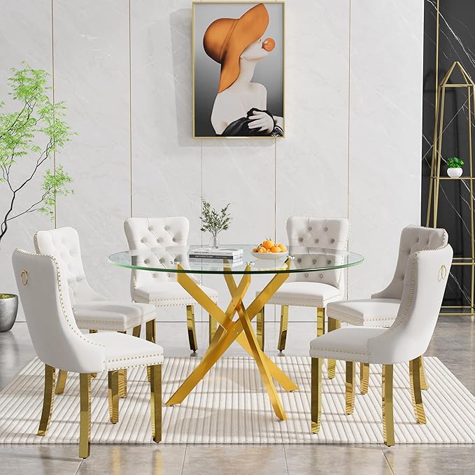 Goujxcy Round Dining Table Set for 6, Modern Glass Kitchen Table and Chairs Set of 6, 7-Piece Dining Room Table Set w/47 Circle Gold Glass Dining Table and 6 Upholstered Velvet Chairs