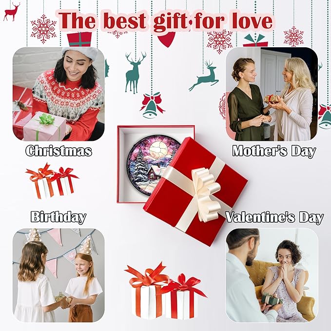 Stained Glass Window Hanging - Winter Snow Scene Cabin Moon Sun Catcher for Door Garden Home Decor Pine Tree Suncatcher Christmas Mother's Day Birthday Gifts for Women Men Mom Nana 11.8 in