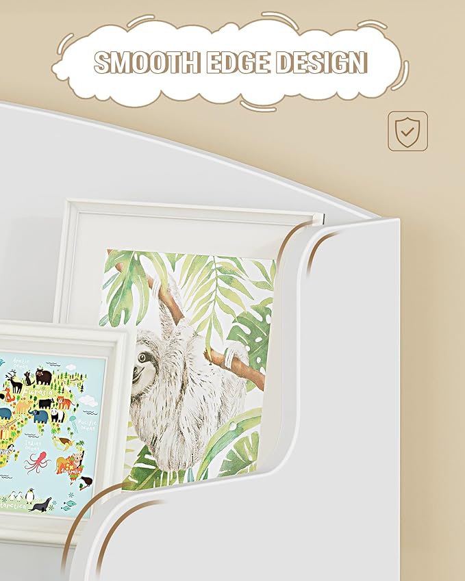- 【Sturdy Bookshelf】The children's bookshelf is equipped with tilt protection. We recommend that you use the anti-tilt device to fix the shelf to the wall to make it more stable. The top corners are rounded to avoid accidental scratches. The metal rods supporting the toy box are fixed together with screws, Shelf panels made of FSC certified wood