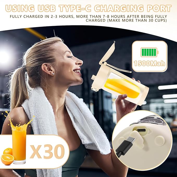 - Long Battery Life: The blender has a built-in 1500mAh battery, type C charging port, can be charged via a power adapter, laptop, mobile power or car charging port; It will produce 20-30 cups of juice on a full charge.Mini portable blender can meet the needs of individual travel and family