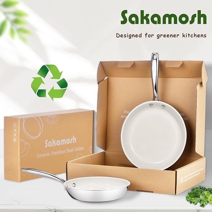 9.5 Inch Nonstick Ceramic Frying Pan, Tri-Ply Stainless Steel Skillet with Stay-Cool Handle, PFAS/PFOA/PTFE Free, No Seasoning Required, High Heat & Induction Safe, Dishwasher/Oven Safe