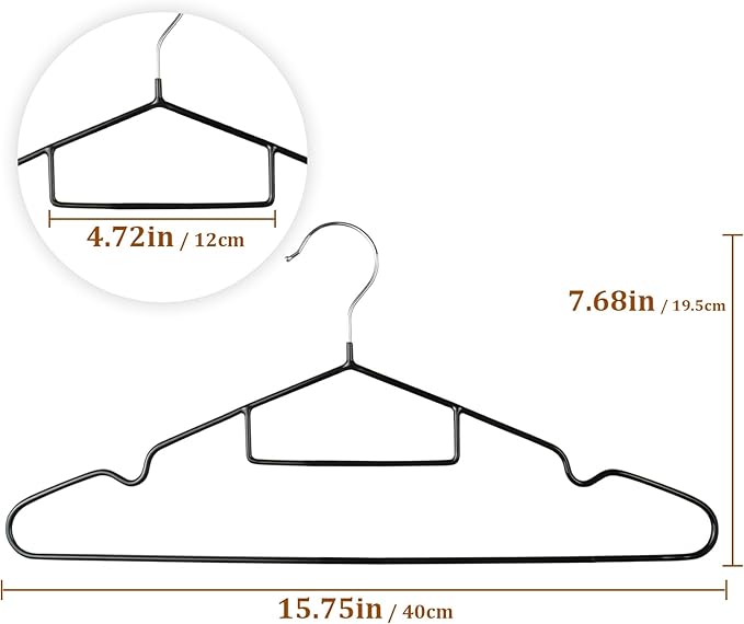 - Maximize closet space: With a slim, space-saving profile, these hangers help you fit more clothes in your closet! The 15.75"W x 7.68"H design is ideal for shirts, pants, suits, and dresses, while the built-in tie bar neatly stores ties, scarves, belts, or even pants hangers space saving solutions