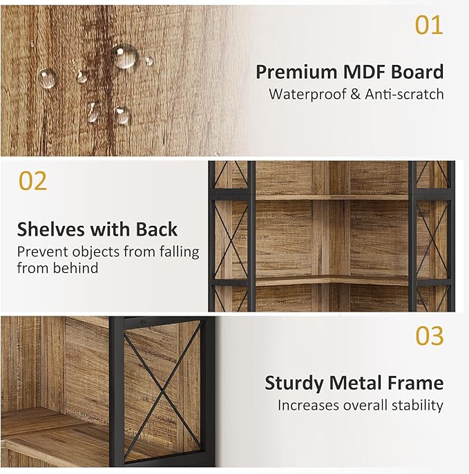 - 【Sturdy and Durable】: Crafted with premium MDF boards and a sleek black metal frame, this corner shelves is built to last. Plus, it comes with adjustable foot pads at the bottom to protect your floors from scratches and ensure the bookshelf stays level, even on uneven surfaces