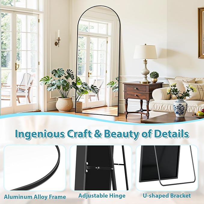 - Premium Material and Unique Design: This stand up mirror full length features a sturdy and durable aluminum alloy thin frame, Its sleek curved shape design makes it ideal for any modern or traditional decorative style, effortlessly enhancing the ambiance of any room
