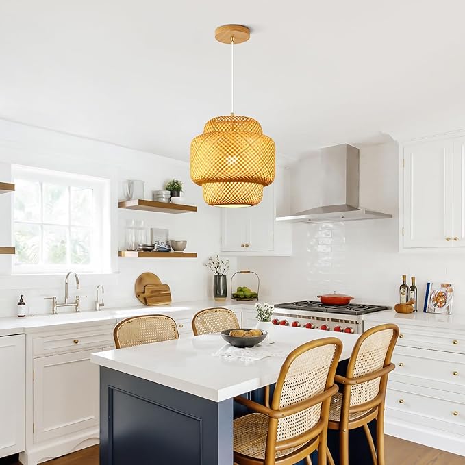 - 【Premium Handcrafted Bamboo Pendant Light】 This boho dining chandelier is crafted from natural bamboo, offering an eco-friendly and artisanal touch to any space. The woven rattan design brings a warm, rustic feel, ideal for kitchens, dining rooms, bedrooms, or living rooms. Perfect as a rattan pendant light for kitchen islands, or as a statement chandelier in dining rooms, it complements both modern and farmhouse décor with its versatile and stylish aesthetic.