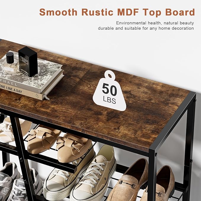 - Sturdy and Durable: The shoe rack is built with quality particleboard and metal, strong and bearable. The top panel can undertake 50 lb and each mesh shelf 25 lb. The robust frame offers maximum stability and durability,the side X-shaped design offers doubled enhancement for overall stability, the four adjustable feet allow for easy leveling on uneven surfaces, so you can trust that your shoes and other items will remain safely stored for years to come