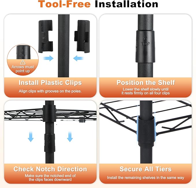 - Easy Assembly: Designed for tool-free assembly, the 4-Tier Metal Storage Rack can be easily installed by aligning plastic clips with grooves on the poles and resting the shelves on the clips. Follow the simple steps to secure all tiers and meet all your storage needs.