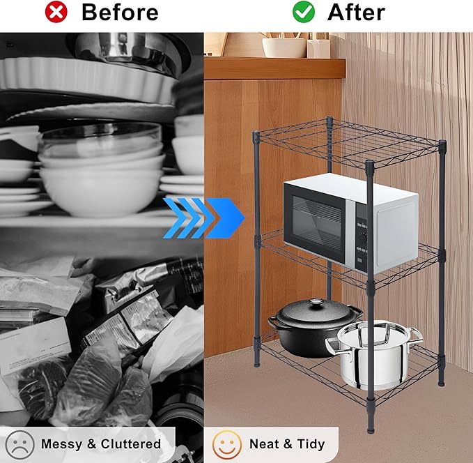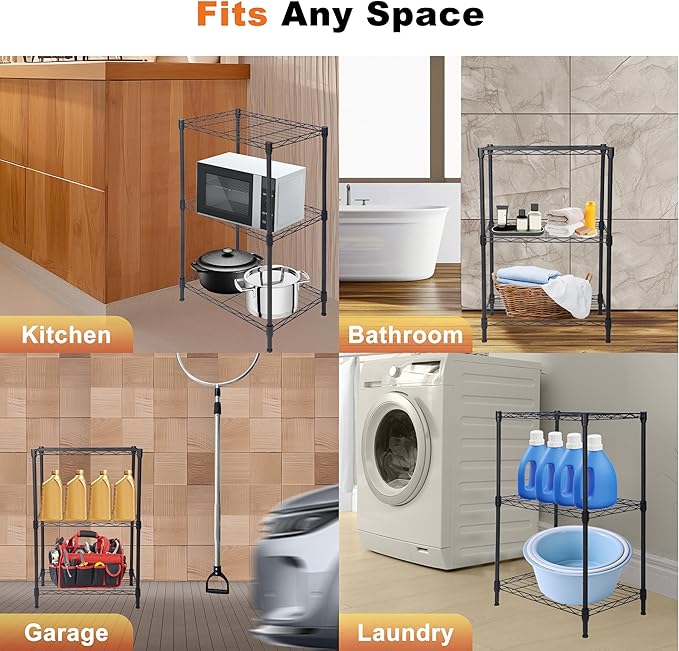 - Multi-Purpose Use: 3-Tier wire shelving (18" L x 12" W x 26.4" H) fits compact spaces yet holds bulkier items effortlessly. Ultra-narrow spacing secures small tools, plants, or pantry jars without slipping, transforming cluttered corners into organized zones, Ideal for various spaces such as kitchens, bathrooms, garages, and laundry rooms