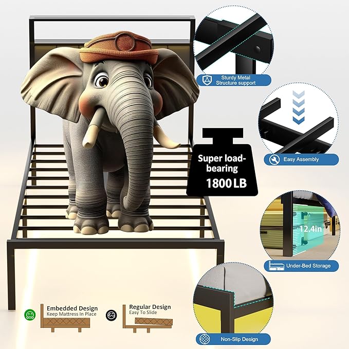 - COOL MULTI-FUNCTIONAL LED LIGHTS: This Twin bed frame with LED lights is available in over 60,000 colors, and you can adjust the color, brightness, mode, and timer function according to your preference via mobile APP or remote control. The combination of cool lights and music can create a romantic or dynamic atmosphere in your bedroom.