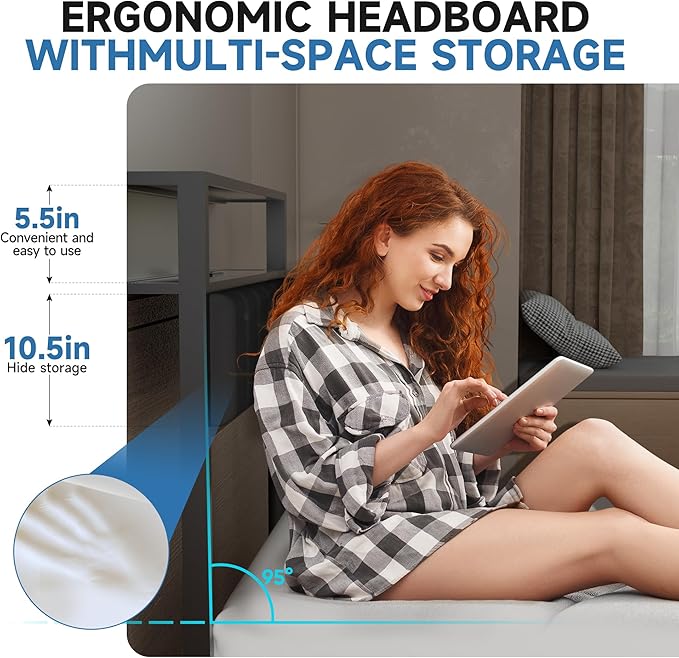 - HEADBOARD WITH CHARGING STATION: This bed headboard built -in 2 standard power outlet & 2 USB ports, which can totally charge your electronic devices at the same time. No need to struggle with messy cords or search for an available outlet - you can effortlessly charge your lamps, phones, and iPads all in one place.