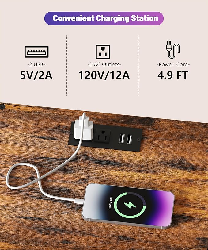 - Power Outlets: The charging end table is built with 2 AC outlets, 2 USB ports, and a 4.9-foot power cord, making it simple to charge your electronic devices. Whether used as a living room side table or a bedside companion, it lets you power up your phone, tablet, desk lamp, and game console all at once. Say goodbye to the annoyance of insufficient sockets