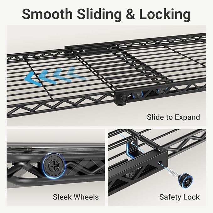 - Flexible Adjustment & Secured Locking: All the clothing rack wire shelves and hanging rods can be lengthened or shortened (24" to 41") based on your needs. They are equipped with secured locking gadgets, eliminating the annoyance of overextending