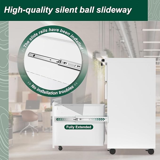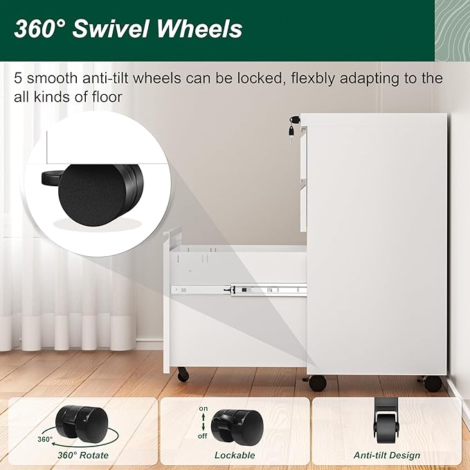 - ❤Mobile File Cabinet -- This mobile filing cabinet is equipped with five rubber wheels, so you don't have to worry about the wheels scratching the floor. In particular, the front central caster to prevent tipping over. And four of the wheels can rotate 360 degrees for stability.