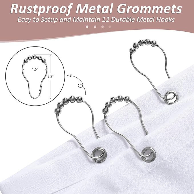 - Rust-Resistant Metal Grommet Holes: Tear Resistant and Reinforced Top Header; Each fabric shower curtain features 10 reinforced metal grommet holes and 10 premium plastic hooks rings (to guarantee no rust) are included in each package.