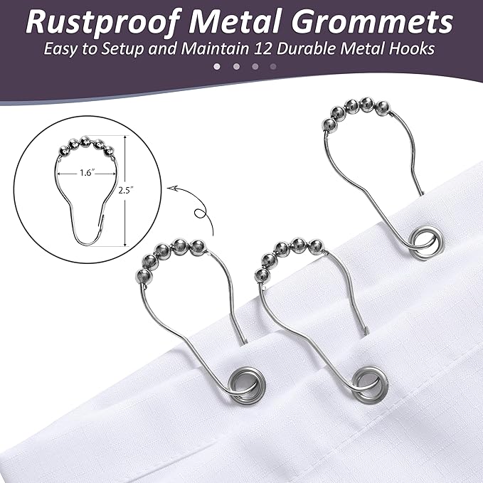 - Rust-Resistant Metal Grommet Holes: Tear Resistant and Reinforced Top Header; Each fabric shower curtain features 10 reinforced metal grommet holes and 10 premium plastic hooks rings (to guarantee no rust) are included in each package.
