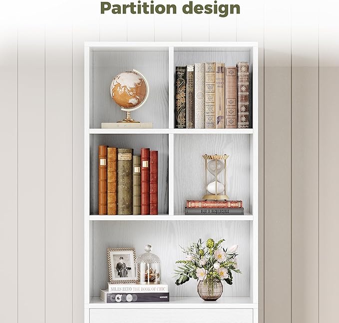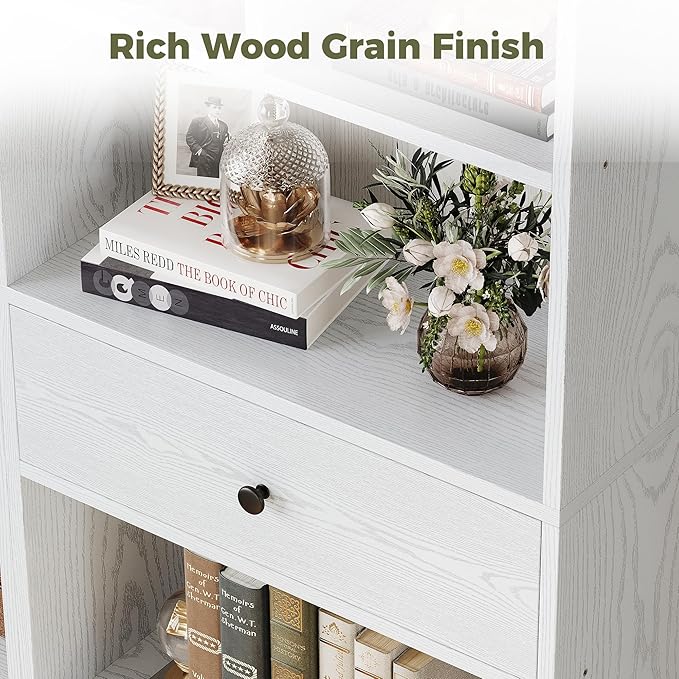 IRONCK Bookcase and Bookshelves, 70" Tall Bookshelf Floor Standing 6 Tiers Display Storage Shelves, Book Shelf with Drawers for Home Office, Living Room, Bedroom, Library, White