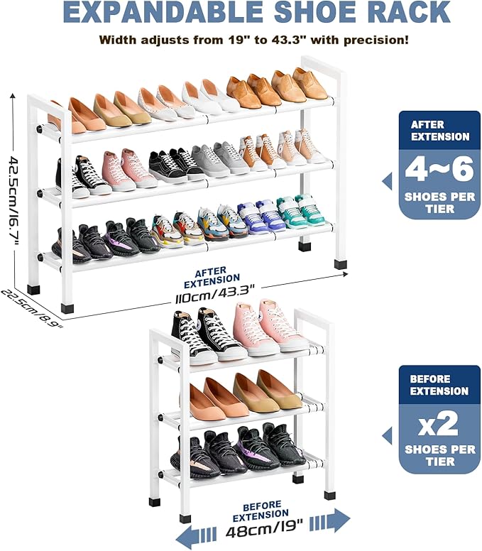 - 3-Section Precision Adjustment: Expand from 19 to 43.3 inches to fit closets, hallways,and entryways. This expandable shoe rack adapts to any space. Perfect as a closet shoe rack or adjustable shoe rack for dynamic home layouts