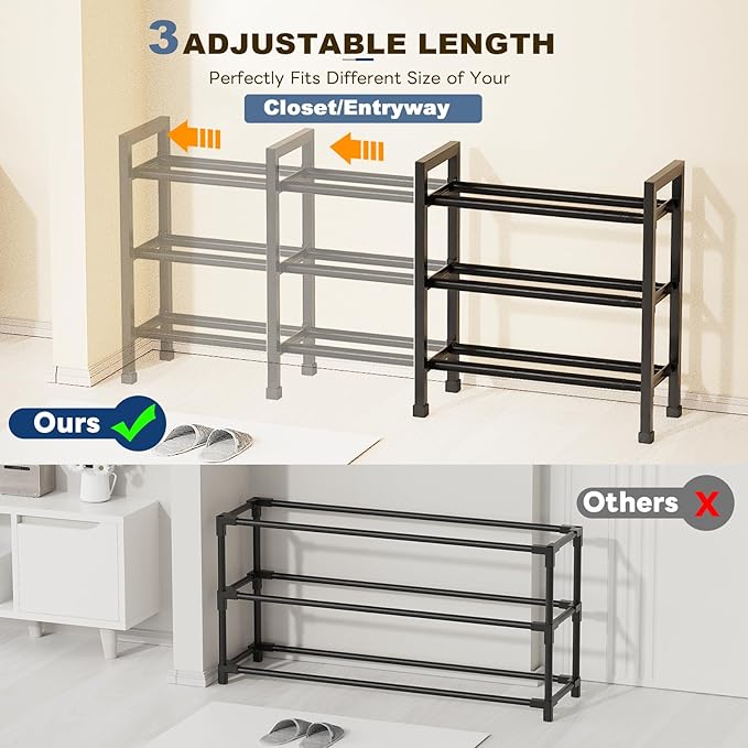 Mavivegue 3 Tier Expandable Shoe Rack for Closet, 19“- 43” Adjustable Shoe Rack for Entryway, Shoe Shelf, Black