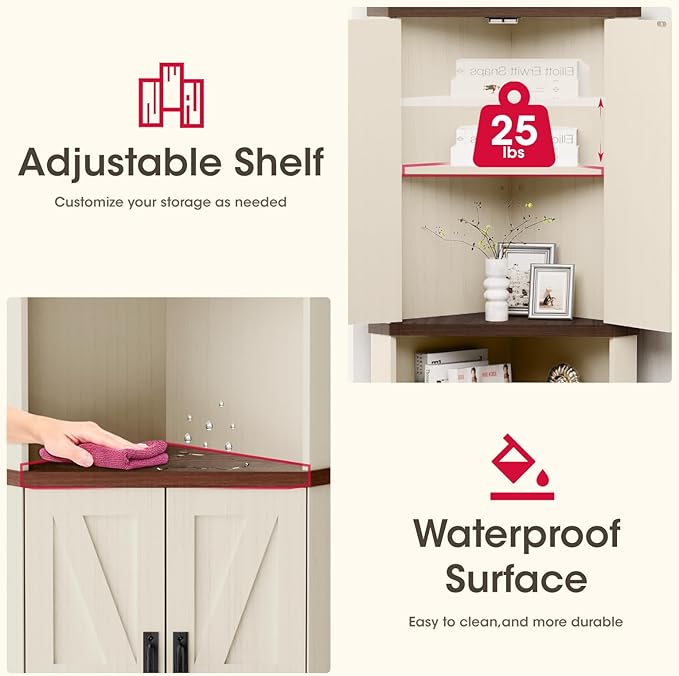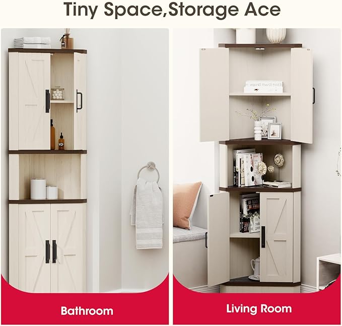 - [Stability & Safety] The 90° right-angle design ensures seamless installation in wall corners. Built with a sturdy base and an anti-tip bracket (directly wall-mounted for added security), this cabinet prioritizes safety and stability. Rest easy—even with active kids or pets around—knowing it’s designed to stay firmly in place.