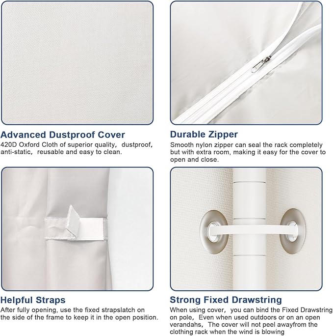 - ▶【ZIPPERED DUSTPROOF COVER】The new P8C Portable Closets is equipped with Zippered Dustproof Cover,Insulates your clothes from dust when using the garment rack,The dustproof cover has zippers for perfect sealing,And also protects your privacy when you have guests visiting your home,The cover is very easy to clean,The waterproof material just needs to be gently wiped with damp cloth and it looks brand new!