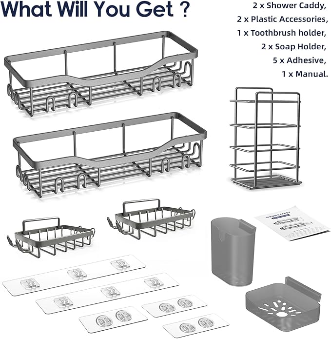 - What Will You Get: 2 x black shower caddy, 1x toothbrush holder, 2x soap holder, 2 x plastic accessories, 5 x adhesive, 1x manual. The bathroom organizer shelf ideal for all your washing essentials such as shampoos, facial cleansers, loofahs, kids bath toys, razors, a sleek and functional addition to your bathroom organization. If you have any problems, please feel free to contact us, we will provide satisfactory solutions