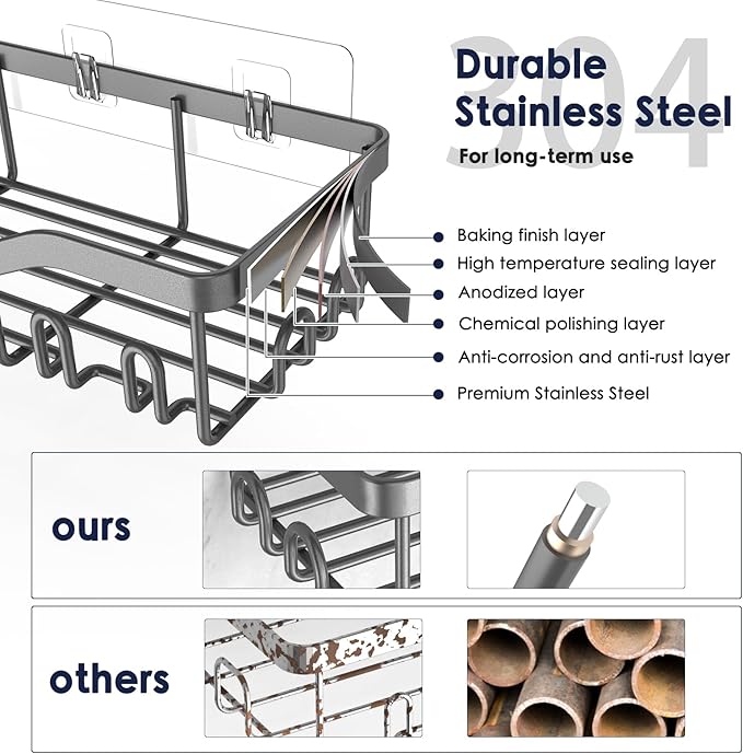 - Durable Rust-Resistant Stainless Steel: Expertly crafted from top-grade 304 stainless steel, with powder-coated process, bathroom shower shelves are tough, durable, stable, rustproof and scratch-proof. NESOMI shower rack rustproof powder-coated and solid frame wire are significantly thicker, ensuring long-lasting use. It can withstand humid conditions for up to 8 years and is backed by a 8-year warranty. Hollow design ensures ventilation and drainage, easy to keep clean