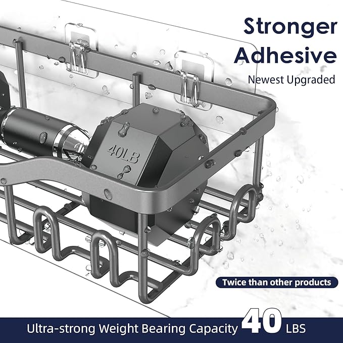- Newest Upgraded Stronger Adhesive Bathroom Caddy: The transparent traceless adhesives give ultra-strong reliability with up to 40 lbs of bearing weight, which is tested by professional institutions. The bathroom shower organizer has twice the load-bearing capacity of the old version. NESOMI bathroom shelf can be installed without drilling. The storage shelves will never worry about falling issues after proper installation, and make your family space use to the extreme