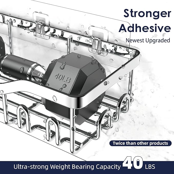 - Newest Upgraded Stronger Adhesive Bathroom Caddy: The transparent traceless adhesives give ultra-strong reliability with up to 40 lbs of bearing weight, which is tested by professional institutions. The bathroom shower organizer has twice the load-bearing capacity of the old version. NESOMI bathroom shelf can be installed without drilling. The storage shelves will never worry about falling issues after proper installation, and make your family space use to the extreme