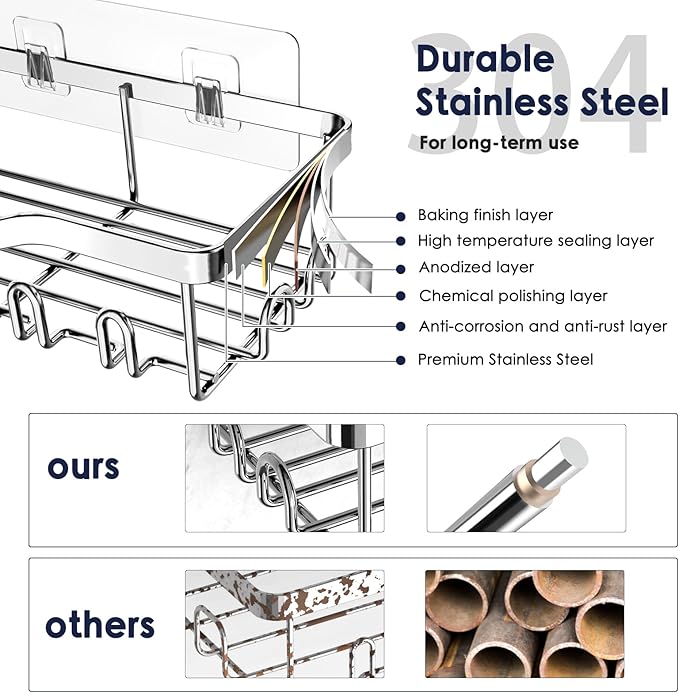 - Durable Rust-Resistant Stainless Steel: Expertly crafted from top-grade 304 stainless steel, with powder-coated process, bathroom shower shelves are tough, durable, stable, rustproof and scratch-proof. NESOMI shower rack rustproof powder-coated and solid frame wire are significantly thicker, ensuring long-lasting use. It can withstand humid conditions for up to 8 years and is backed by a 8-year warranty. Hollow design ensures ventilation and drainage, easy to keep clean