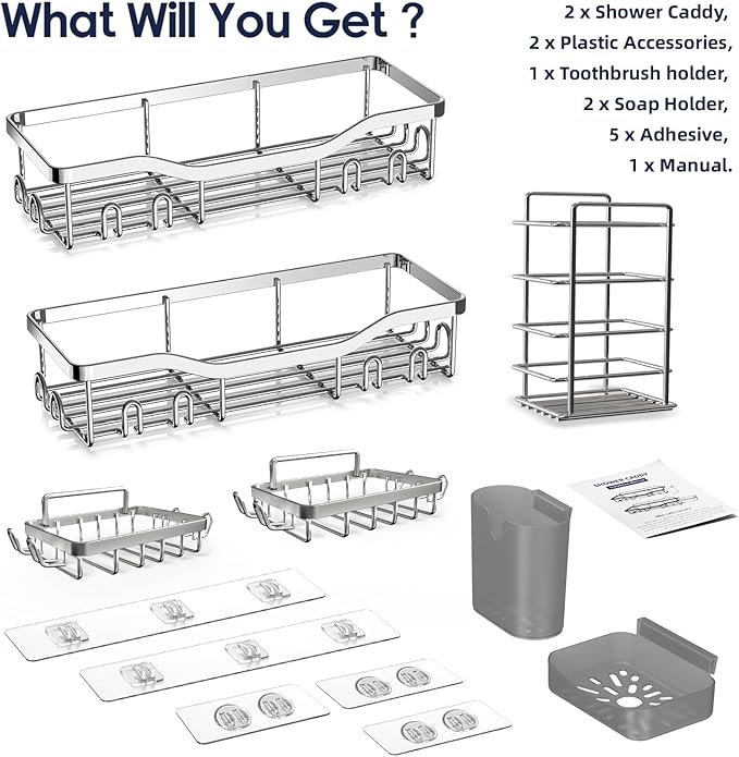 - What Will You Get: 2 x black shower caddy, 1x toothbrush holder, 2x soap holder, 2 x plastic accessories, 5 x adhesive, 1x manual. The bathroom organizer shelf ideal for all your washing essentials such as shampoos, facial cleansers, loofahs, kids bath toys, razors, a sleek and functional addition to your bathroom organization. If you have any problems, please feel free to contact us, we will provide satisfactory solutions