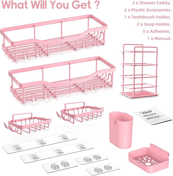 - What Will You Get: 2 x black shower caddy, 1x toothbrush holder, 2x soap holder, 2 x plastic accessories, 5 x adhesive, 1x manual. The bathroom organizer shelf ideal for all your washing essentials such as shampoos, facial cleansers, loofahs, kids bath toys, razors, a sleek and functional addition to your bathroom organization. If you have any problems, please feel free to contact us, we will provide satisfactory solutions