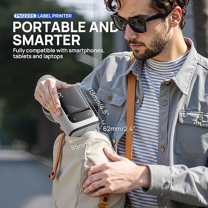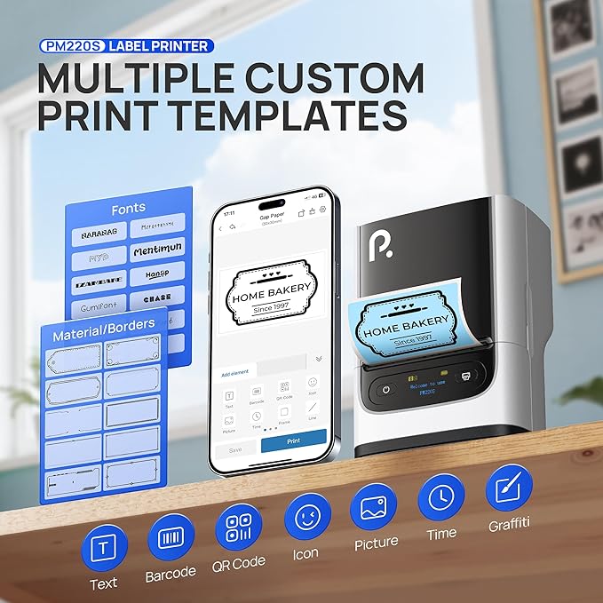 - Feature-Rich App: PM220S label maker machine with tape comes with label templates and can set up your own templates.The label printer app supports QR codes, barcodes, tables, text, icons, and more. Enjoy 90+ fonts, 14+ languages, and 450+ material presets. Pro tip: Use our specialized labels for optimal results—avoid tearing the green back sticker to prevent printing issues.