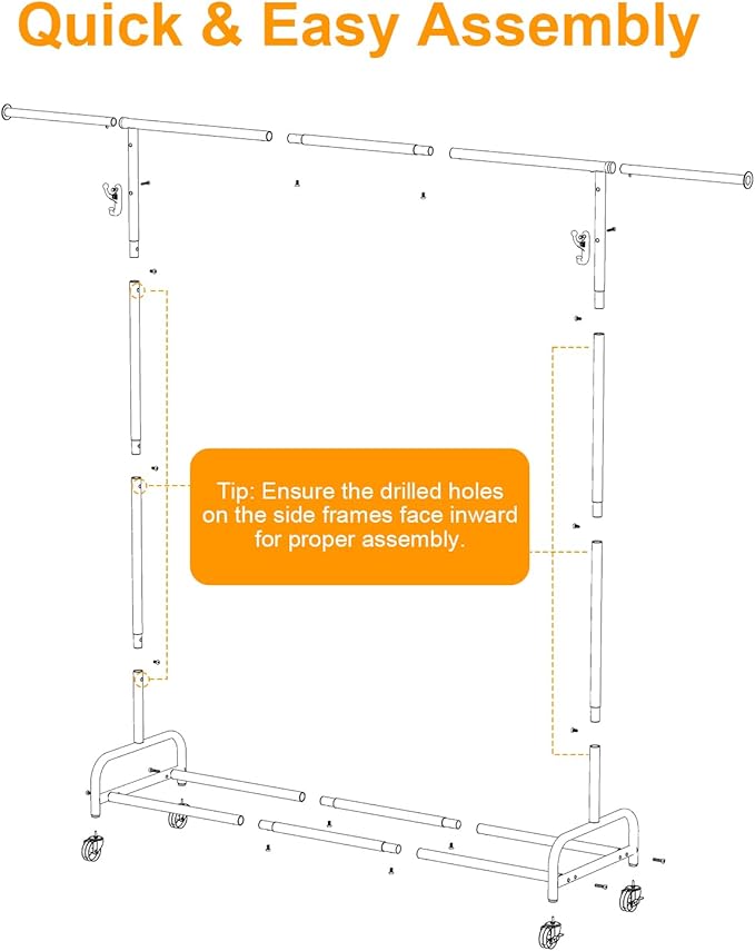 - 【Quick & Easy Assembly】Comes with detailed step-by-step instructions for fast installation in as little as 20 minutes. (Tip: Ensure the drilled holes on the side frames face inward for proper assembly.) Perfect for those looking for a portable clothing racks for hanging clothes that’s easy to set up and move.