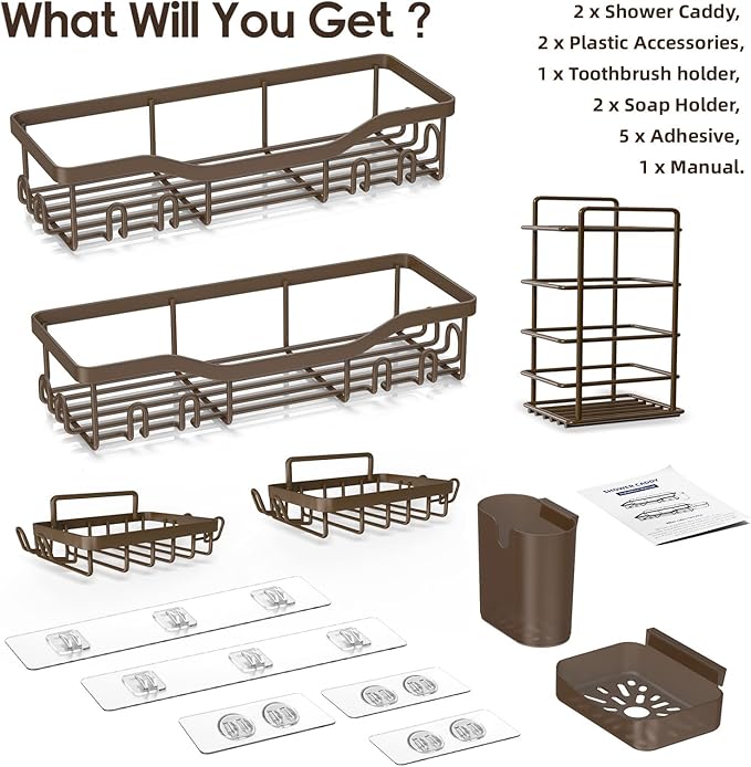 - What Will You Get: 2 x black shower caddy, 1x toothbrush holder, 2x soap holder, 2 x plastic accessories, 5 x adhesive, 1x manual. The bathroom organizer shelf ideal for all your washing essentials such as shampoos, facial cleansers, loofahs, kids bath toys, razors, a sleek and functional addition to your bathroom organization. If you have any problems, please feel free to contact us, we will provide satisfactory solutions