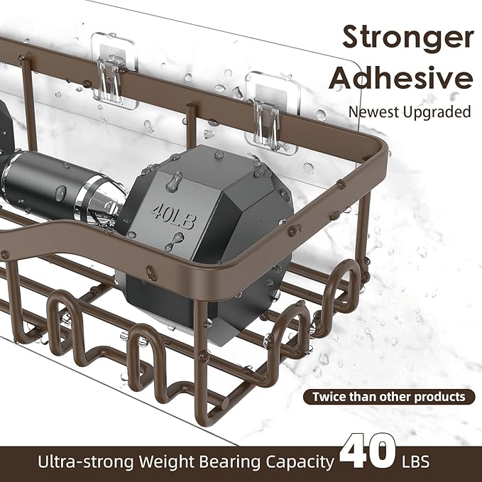 - Newest Upgraded Stronger Adhesive Bathroom Caddy: The transparent traceless adhesives give ultra-strong reliability with up to 40 lbs of bearing weight, which is tested by professional institutions. The bathroom shower organizer has twice the load-bearing capacity of the old version. NESOMI bathroom shelf can be installed without drilling. The storage shelves will never worry about falling issues after proper installation, and make your family space use to the extreme