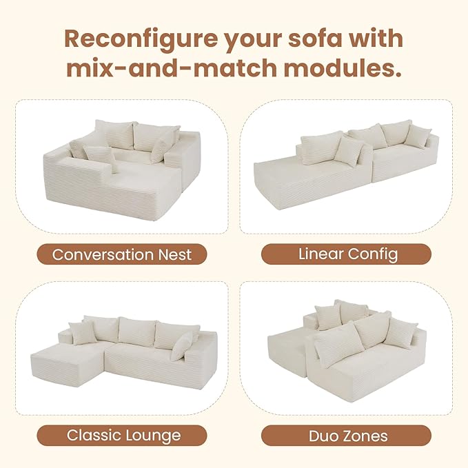 - Modular & space-smart: Customize your living space with our L-shaped couch, combining a chaise and corner piece for flexible arrangements. Ideal for movie nights, gatherings, or solo lounging, it adapts to both spacious and cozy rooms. Rearrange effortlessly to suit your needs—whether hosting friends or creating a play zone for kids.