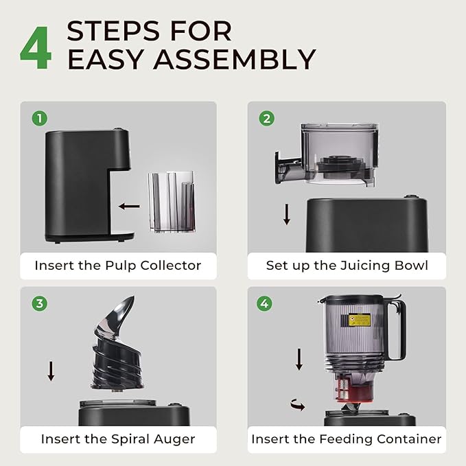 - 【Easy to Clean】Our all-in-one cold press juicer has a simple structure, consisting of only three main parts, and comes with a special cleaning tool, which makes assembly, disassembly and cleaning easy and quick.
