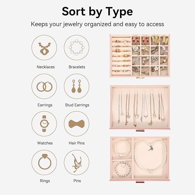 - DIY Considerate Details: This sleek jewelry box comes with stackable layer and removable compartments create large capacity and different layout. With removal baffles can meet different needs and keep all types of jewelry organized, neatly, beautifully displayed. You can visually see all of your precious belongs, makes selection easier,while being space savvy!