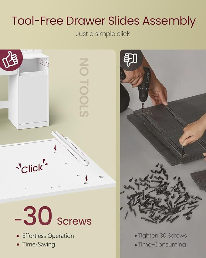 • Tool-Free Drawer Slides Assembly: Our unique snap-in design allows you to easily click the drawer glides into place—no screws, no tools, no hassle!