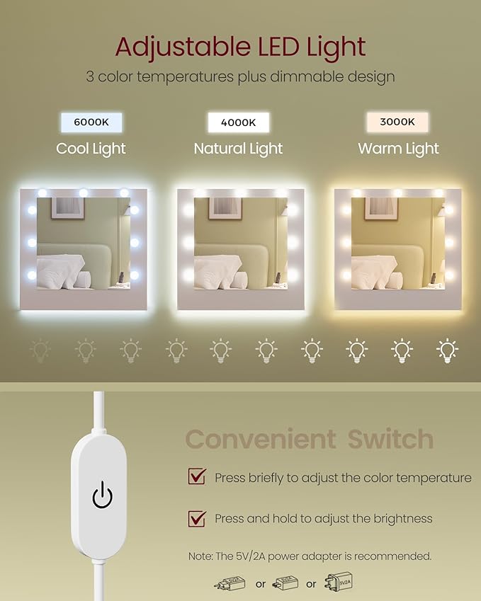 • Lights With Adjustable Brightness: The vanity mirror of this makeup vanity is surrounded by 9 adjustable bulbs, allowing you to customize the brightness for flawless makeup application