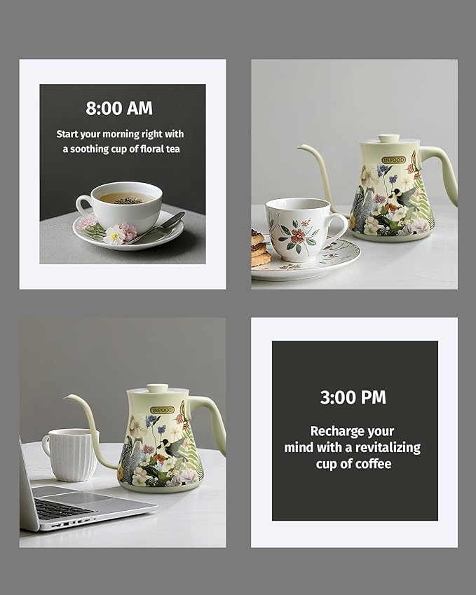INFOOD 0.8L Gooseneck Electric Kettle, Precise Temperature Control for Pour Over Coffee & Tea, 1200W Fast Boiling Water, Auto Shut Off, Scheduling, Stainless Steel, Floral Painted Design
