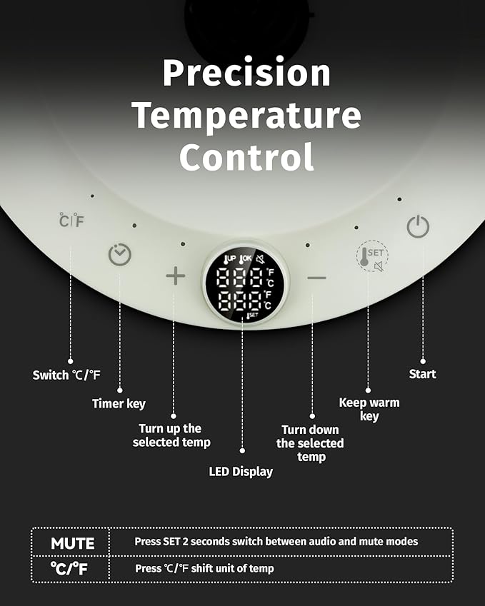 - Hold Your Heat: After boiling, press "SET" to enter Keep Warm mode and maintain your desired water temperature. Use the "+" and "-" buttons to fine-tune the hold temperature between 104°F and 212°F (40°C to 100°C). Perfect for pour-over coffee, delicate teas, instant oatmeal, or keeping hot water ready throughout the day, no need to reheat between brews