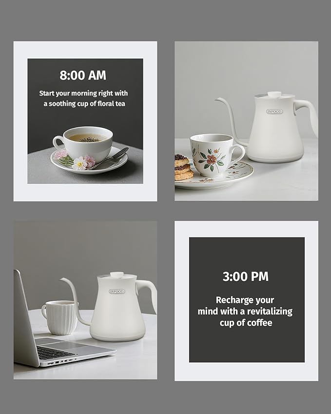 INFOOD 0.8L Gooseneck Electric Kettle, Precise Temperature Control for Pour Over Coffee & Tea, 1200W Fast Boiling Water, Auto Shut Off, Scheduling, Stainless Steel, White