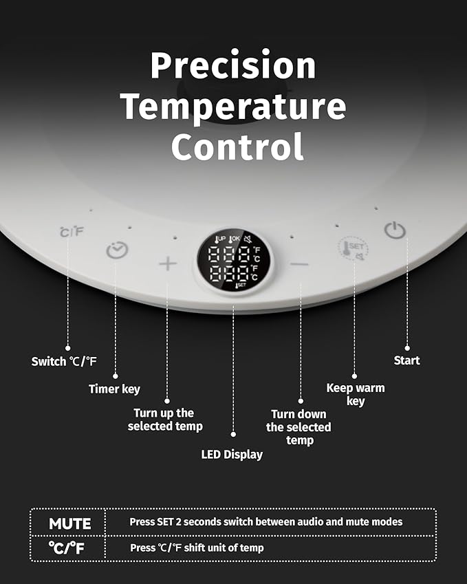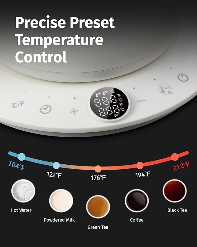 • Hold Your Heat: After boiling, press "SET" to enter Keep Warm mode and maintain your desired water temperature. Use the "+" and "-" buttons to fine-tune the hold temperature between 104°F and 212°F (40°C to 100°C). Perfect for pour-over coffee, delicate teas, instant oatmeal, or keeping hot water ready throughout the day, no need to reheat between brews