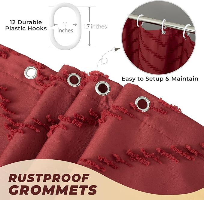 - 【Burgundy Red Shower Curtain – Stylish & Strong for Any Bathroom】Whether you're going for bold and modern or soft and girly, this red shower curtain suits various styles—from preppy dorm bathrooms to elegant home spaces. Reinforced top header with 12 grommets ensures strength, drape, and long-term use.
